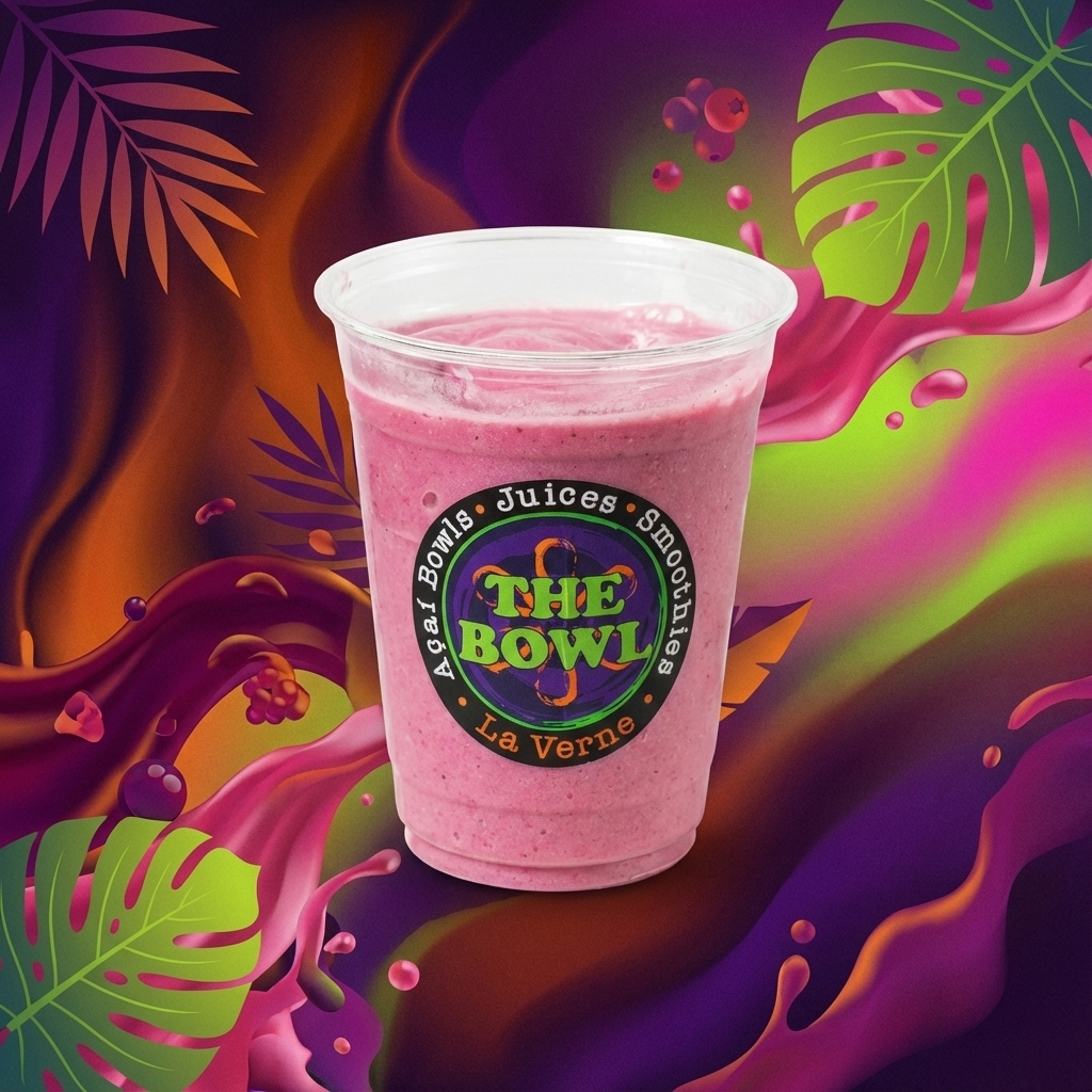 Organic Pitaya, Almond or Peanut Butter, Vanilla Protein, Banana, Strawberries, Vanilla Almond Milk